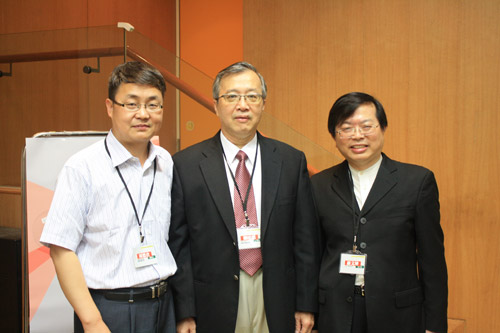 | 周德仓教授与中国文化大学新闻暨传播学院院长叶明德(中)、广告系主任罗文坤先生(右)在本届论坛 |