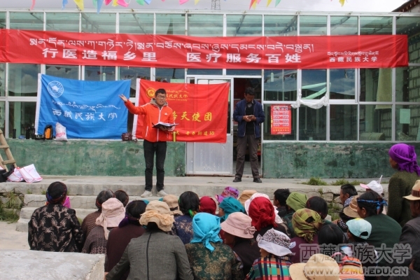 以医学部学生为主的“丝路天使团”重点开展了“四讲四爱”主题教育实践活动。7月22日至27日,丝路天使团队在拉萨市城关区神力时代广场对过往市民进行常见疾病的口头宣讲及传单发放,并进行血压测量;在海拔近5000米的山南市浪卡子县,进行“四讲四爱”主题教育实践活动及医疗知识宣讲,进行免费血压测量;在浪卡子县浪卡子镇翁果村,因地制宜,细化内容,针对藏区群众的高海拔生活环境及高脂肪饮食对高血压、肺结核等常见疾病进行宣传,向贫困农牧民发放大米、暖壶等慰问品并设置有免费血压测量点,并邀请援藏医生进行协助义诊;在白地乡叶色村,为农牧民进行常见病的宣讲、心肺复苏的流程讲解、血压的测量以及精彩的文艺汇演;在浪卡子县养老院,为老人清洗衣物,按摩腿脚,打扫房间,讲解常见病的预防知识,为他们的健康保驾护航,让这一抹夕阳红透雪域高原。团队学生用自己学到的知识回馈家乡,是用实际行动践行“讲贡献爱家园”的表现,他们帮助家乡的乡亲们提高健康意识,增强身体素质,带领乡亲们“讲文明爱生活”。