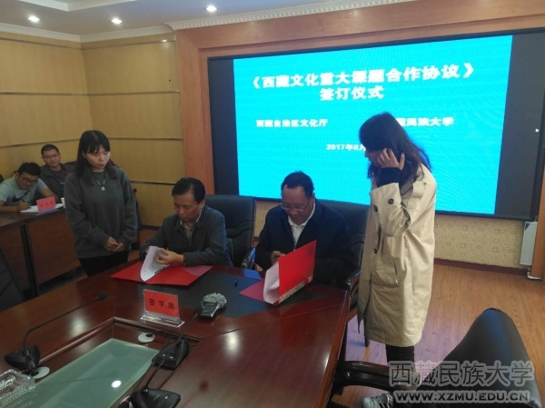 党委常委、副校长扎西卓玛,自治区文化厅党组成员、副厅长桑布,党组成员、纪检组长张亮明,以及双方相关部门负责同志出席签字仪式。