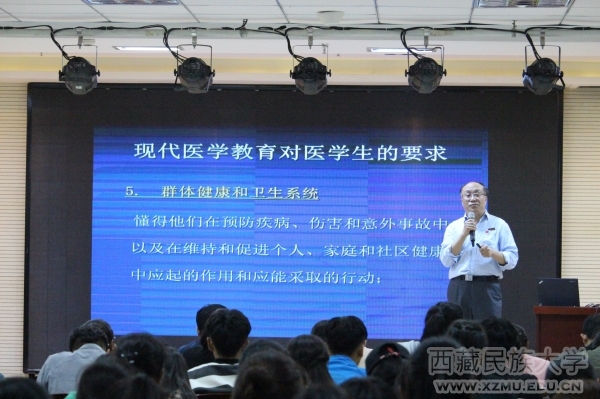 袁东亚代表学校和医学部向全体新生致以节日的问候,并以医学专业师长的身份为新生们带来了“医学发展与医学教育”的精彩讲座。他从历史渊源的角度向同学们讲述了医学事业的发展历程:原始医学、经验医学、近代医学或实验医学、现代医学。并从医学的基本范畴和医学模式的变革出发,阐明了生命、健康、衰老、死亡之间的关系;从自身的学医经历出发,联系当今的生活现象、医患关系,详细而深入地为大家介绍了目前的医疗环境、医疗政策等前沿问题。针对医学学科发展和大学生涯规划,袁东亚寄语全体新生:一是要培养良好的职业态度、价值取向、专业技能,以批判的精神全面提升自我;二是要牢固树立思想道德与职业素质目标,做有信仰、有道德、有品行、有才干的医学专业人才;三是要合理规划人生目标,一步一个脚印,为个人自身的发展和祖国医疗事业的建设贡献自己应有的力量。
