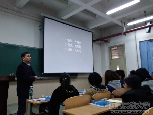 何朝荣教授还受邀为外语学院17级英语专业英尼复语方向学生作题为 “会语言、通国家、精领域——尼泊尔语言高端复合型人才的培养”的学术讲座。讲座中,何朝荣教授介绍了当前国内尼泊尔语人才培养现状及需求情况,指出在国家推动和实施“一带一路”倡议的大背景下,目前国内尼泊尔语人才呈现出“有需要、有市场、有机遇”的景象。他重点讲述了尼泊尔语高端复合型人才的定位与培养模式,并对“会语言、通国家、精领域”进行了详细阐释。他指出,所谓“会语言”,即要达到“非通用语+英语”的熟练掌握和运用,“通国家”就要成为国别通和区域通,“精领域”就要做到行业通和专业领域通。在自由提问环节,学生就尼泊尔语语音学习和专业发展前景等问题与何朝荣教授进行了热烈互动。何朝荣教授鼓励大家要扎扎实实学好尼泊尔语,要用“小语种,大视野;小语种,大舞台;小语种,大作为”的战略眼光来看待自己的专业学习。