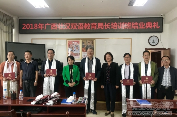 结业典礼上,覃艳娟对本次培训工作进行总结讲话,她从组织有力、纪律严明、学习认真、增进了了解四个方面给予本次培训以高度评价,分析了广西壮汉双语历史文化发展的背景以及现状,并向全体学员提出了今后发展壮汉双语教学的一些思考和工作要求。南宁、柳州、百色、贺州、河池五个小组的代表分别就本次西藏双语教育学习体会进行了交流,各小组对于西藏的双语教学以及基础教育现状与成果用“震撼”一词给予很高的评价,交流了学习考察的收获和今后工作的打算。最后,覃艳娟、贺震明、余高向学员敬献了哈达并颁发了结业证书。