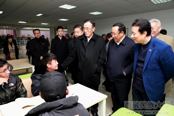 向巴平措与在图书馆学习的同学亲切握手,询问他们来自哪里,学习什么专业,他勉励同学们珍惜韶华,潜心读书,敏于求知,做到德智体美劳全面发展,毕业后为祖国和西藏的建设施展自己的才华,实现自己的人生价值。