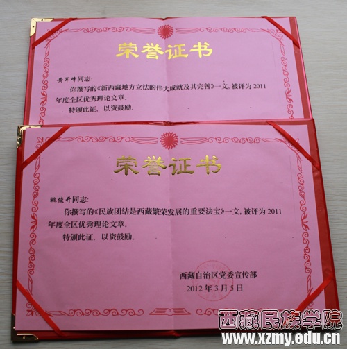 为表彰2011年度西藏自治区社科理论成果,进一步鼓励和激发广大社科理论工作者多出成果、多出精品,切实发挥社科理论工作在育人方面的重要作用,经专家评审组评审推荐,全区共评选出十篇优秀理论文章,自治区党委宣传部予以表彰奖励。西藏民院院法学院黄军峰教授的《新西藏地方立法的伟大成就及其完善》、姚俊开教授的《民族团结是西藏繁荣发展的重要法宝》两篇文章获奖。