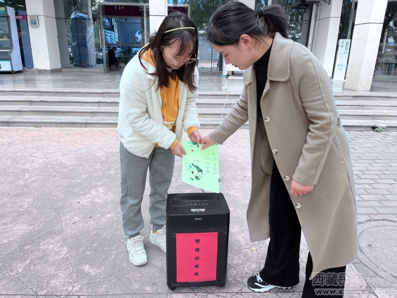 在“手工DIY,我眼中的民大”环节。心理中心准备了各种绘画工具、染卡、彩纸、明信片、白色硬卡纸等,同学们通过彩墨、染卡去随意涂鸦、写意展示,也可在精致的明信片和硬卡纸上去精心描绘,直抒胸臆,感受冬日的民大色彩,记录民大生活的幸福点滴。在“情绪碎纸机,赶跑烦恼和忧愁”中。活动准备了碎纸机、宣泄纸箱、各色彩纸、彩色信笺纸,每种颜色代表了同学们不同的情绪。同学们在情绪纸上写下了自己最近的烦恼、小秘密,感情上的困惑或者同学之间人际关系的小摩擦、学习上的压力,还有对未来的迷茫和期望等等。然后在专门准备的“情绪碎纸机”上粉碎,让所有的烦恼烟消云散。