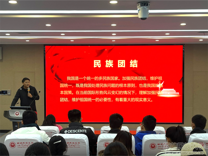 拉巴顿珠通过大量图片、鲜活的故事、详实的数据为同学们细致讲解了西藏和平解放前后在政治、经济、文化、社会等方面发生的巨大变化,深刻阐释了坚持中国共产党的领导,坚持走中国特色社会主义道路,是西藏经济社会发展进步的必由之路。同时,他希望同学们要认清十四世达赖集团的反动本质,坚决反对分裂,牢固树立总体国家安全观,自觉维护祖国统一和民族团结,坚定不移听党话,跟党走,发扬“担当奉献、求真务实、和谐发展”的民大精神,牢记历史使命,牢记责任担当,珍惜在校时光,学好专业知识,练就过硬本领,在实现民族复兴、实现西藏工作总目标的赛道上奋力跑出当代西藏青年的最好成绩。